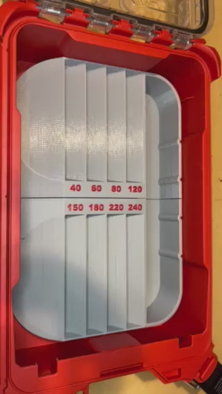 This insert is designed to store and organize your 5" sanding discs. Each slot can hold between 20 and 30 individual discs, and there are several slots to keep the discs organized. The insert is available in 4 different configurations:
