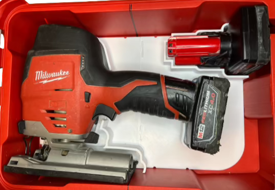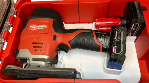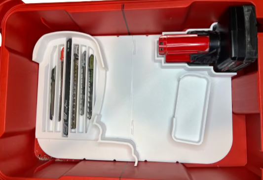 This insert was designed to hold your M12 jigsaw, 2 large format batteries, and an assortment of blades. There are 7 spots for keeping different types of blades organized. It can accommodate about 35 blades in total.