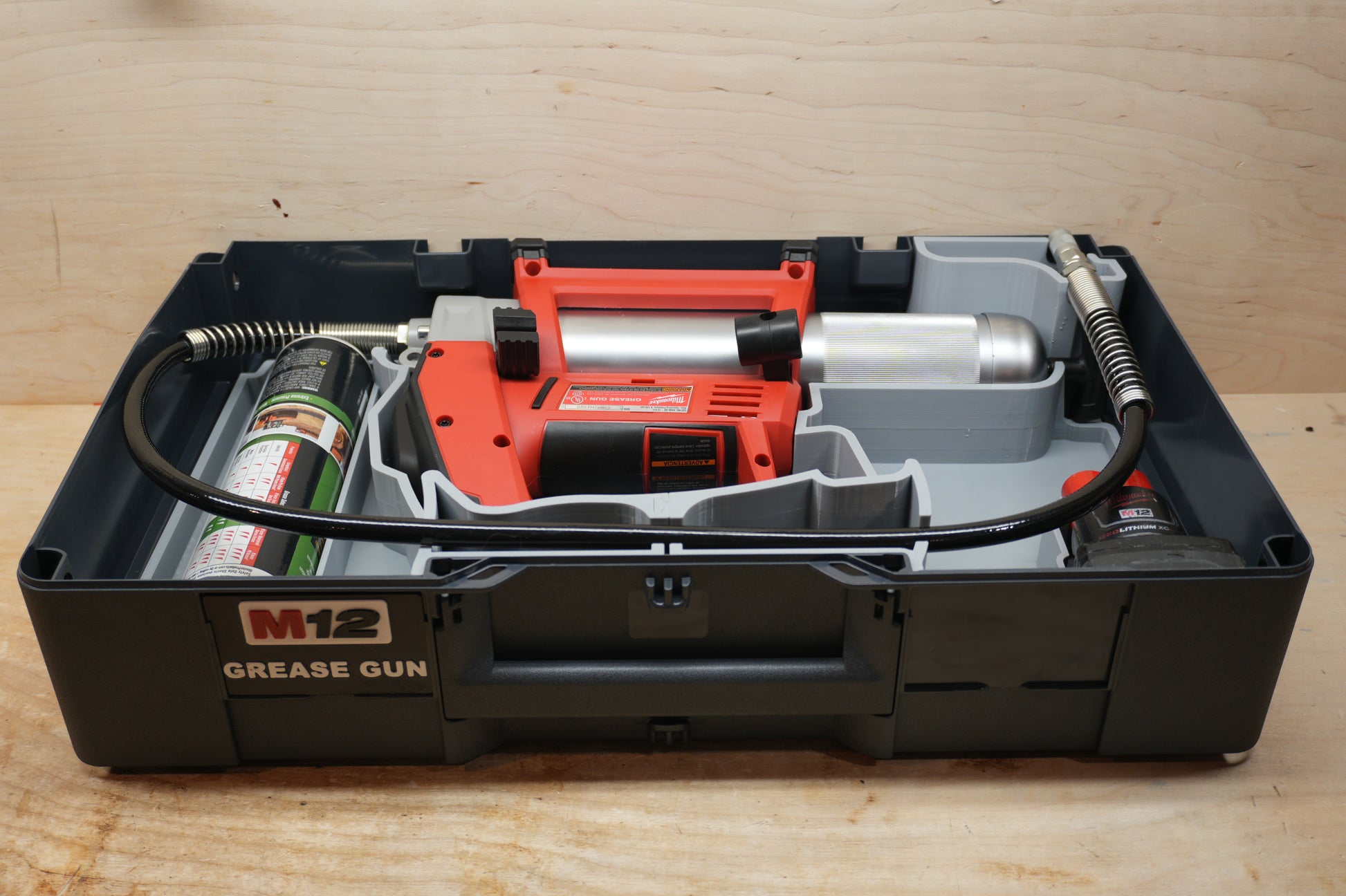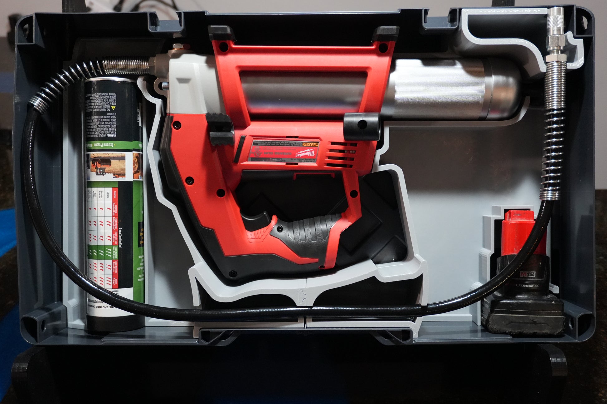 - The grease gun sits with the plunger against the edge of the box, so the box can be modified to allow for storage of the gun with a partially full grease tube still in it.