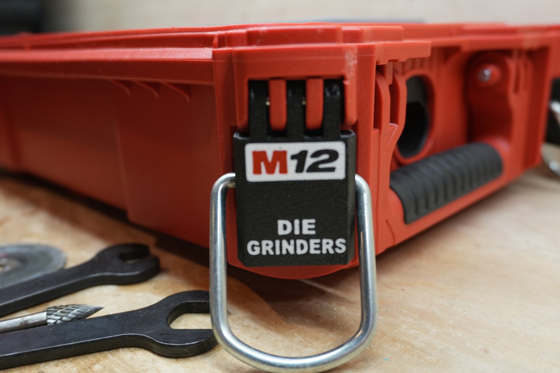 It is available with replacement packout latches that say M12 DIE GRINDER on them. You may select either: