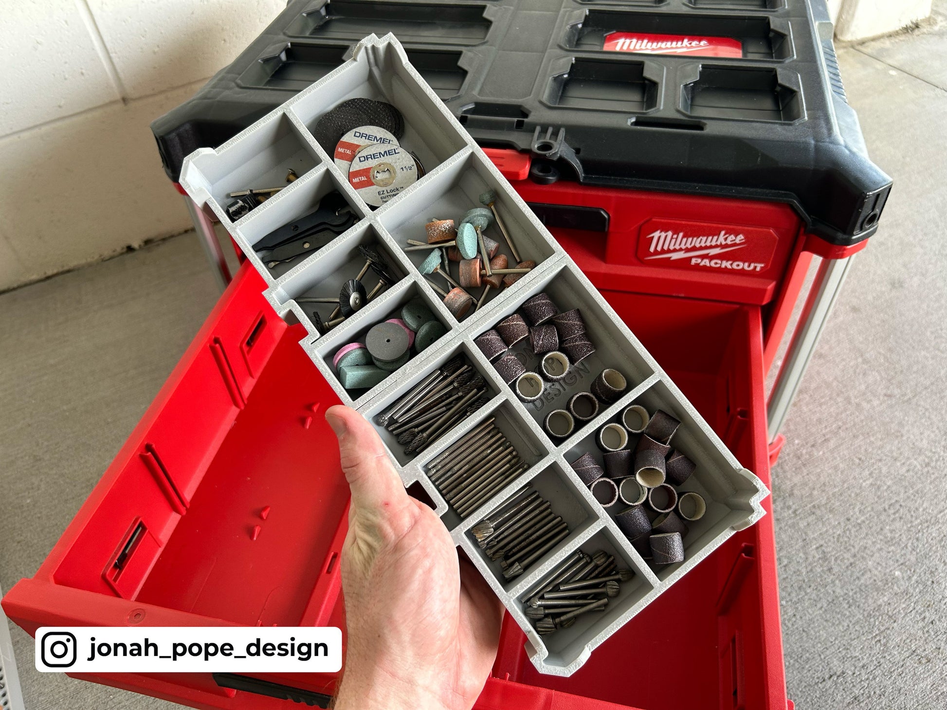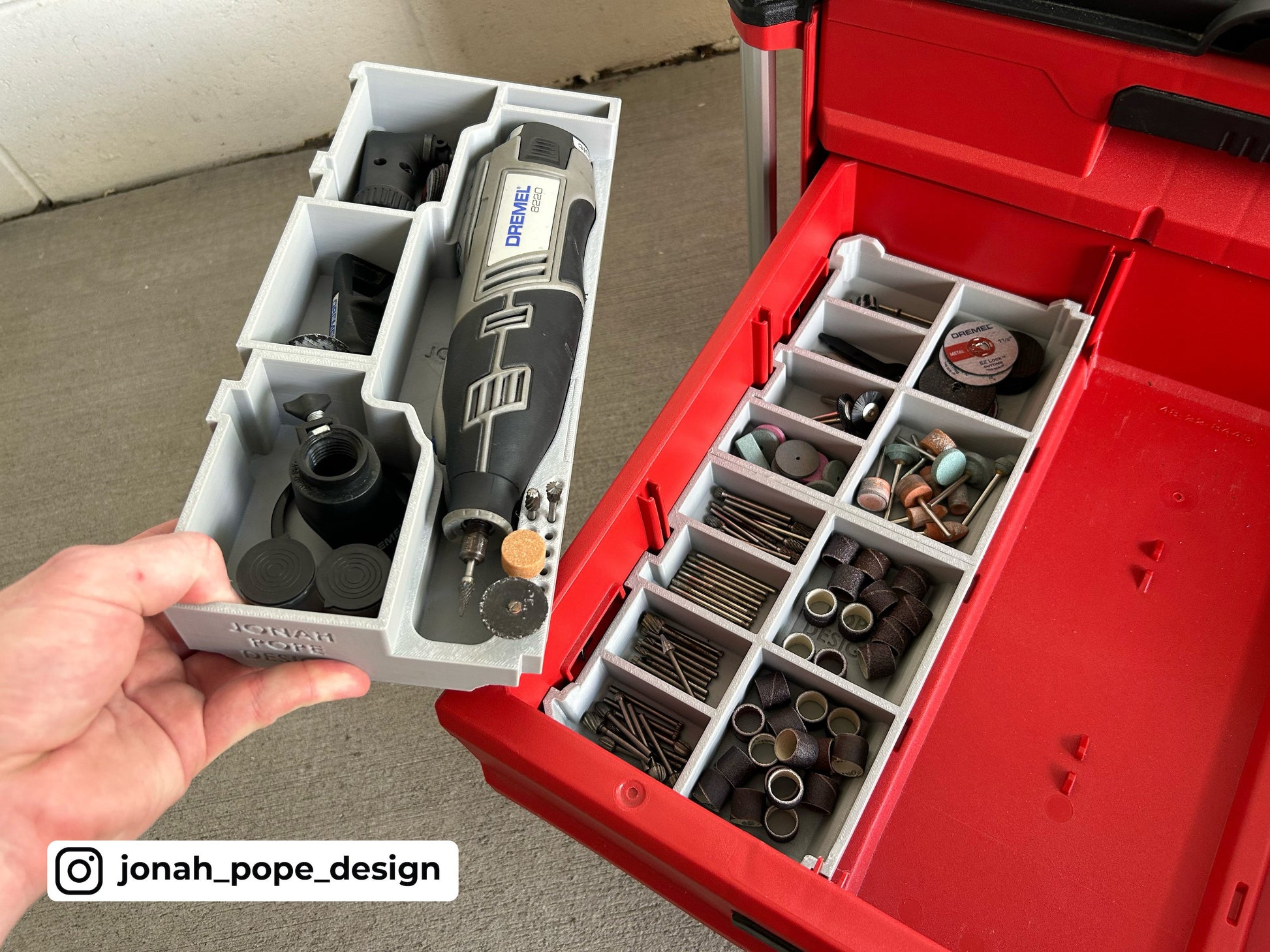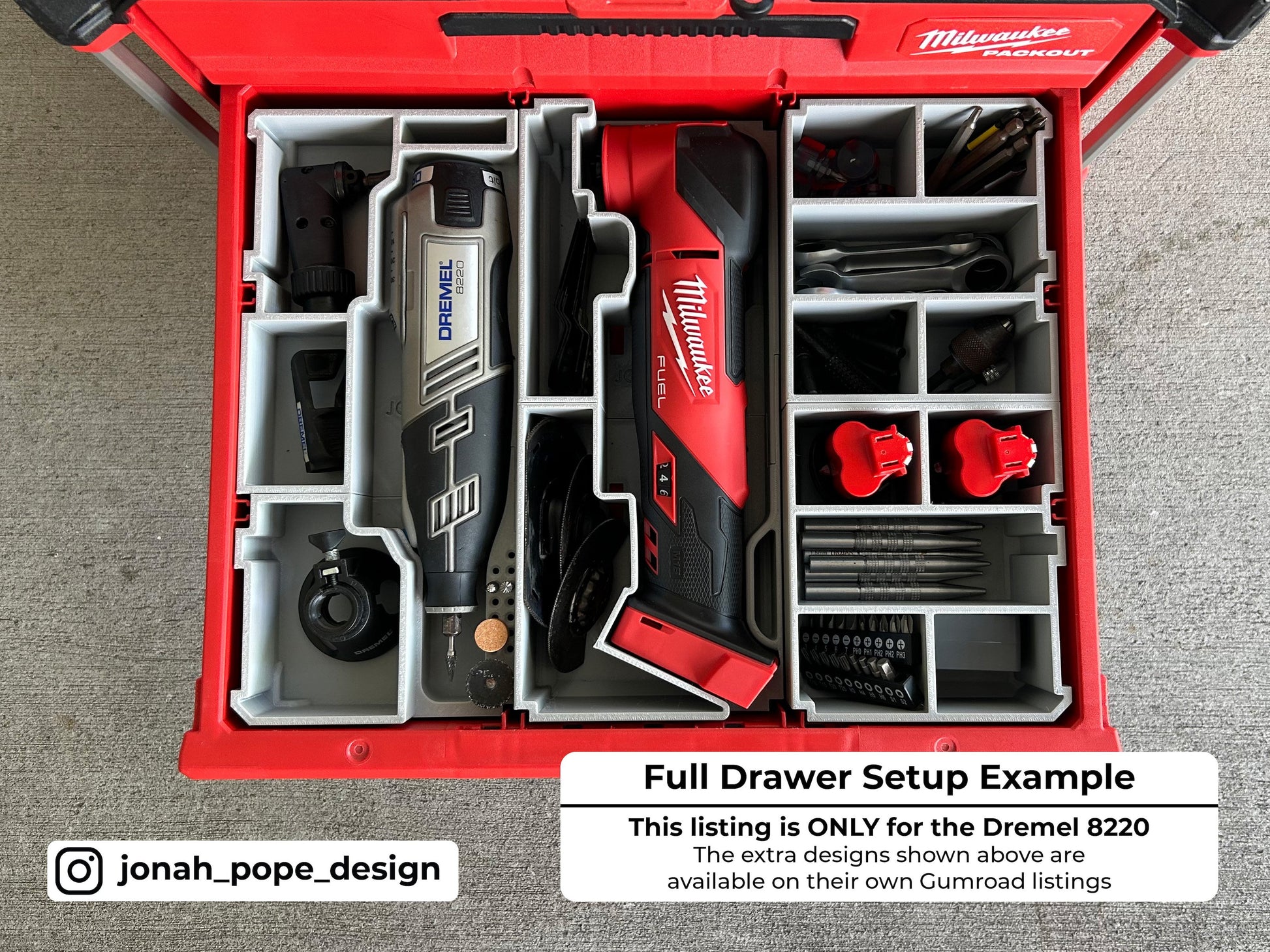 This is a custom insert that I have designed to fit your Milwaukee Packout Drawers to store your Cordless Dremel 8220 and accompanying kit in the Milwaukee 2 & 3 Drawer units (48-22-8443 & 48-22-8442).