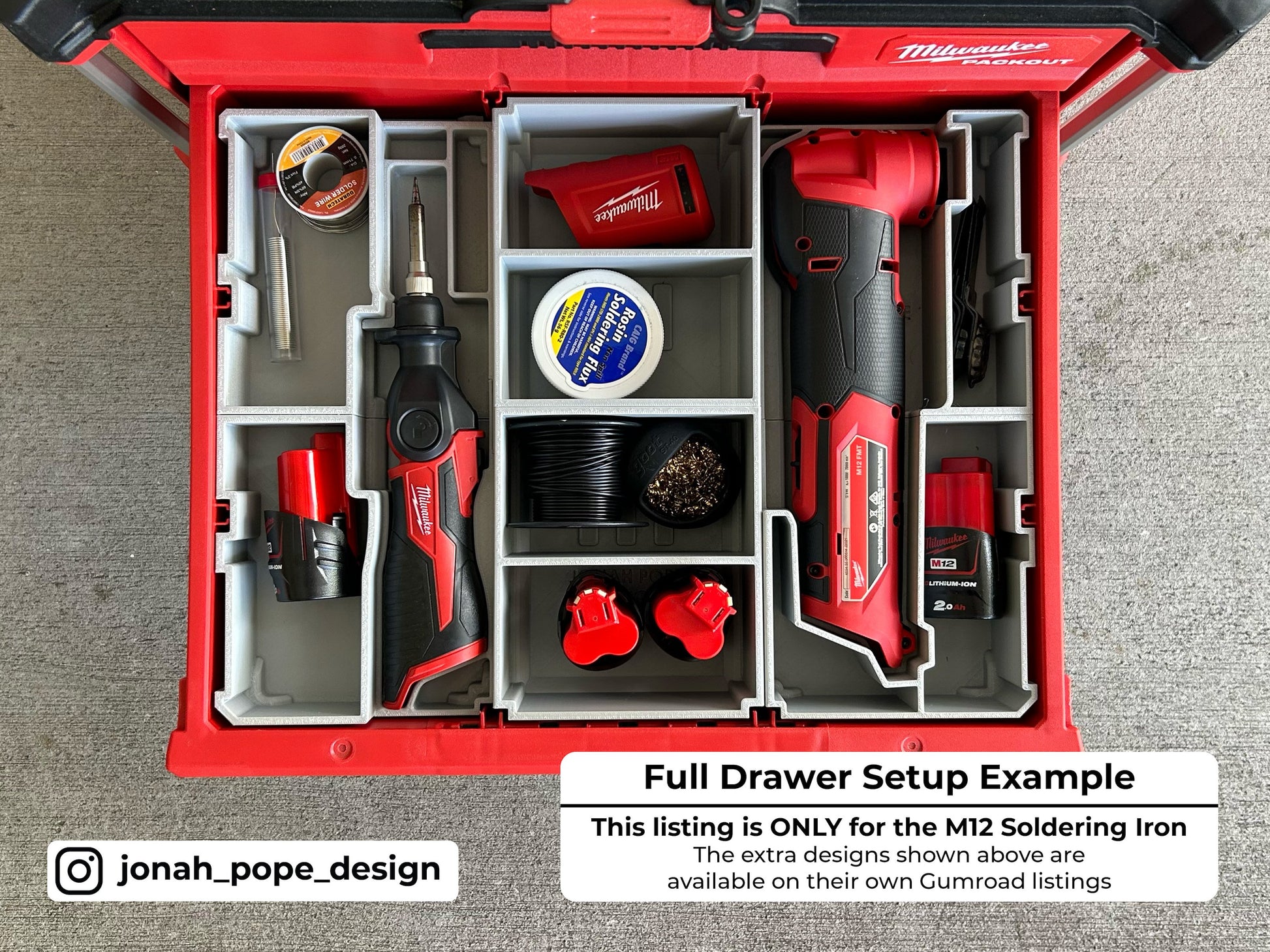 This is a custom insert that I have designed to fit your Milwaukee Packout Drawers to store your M12 Soldering Iron and accompanying kit in the Milwaukee 2 & 3 Drawer units (48-22-8443 & 48-22-8442).